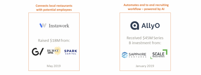 There has been a rise in funding of niche job-posting platforms and networks tailored to specific roles and circumstances. Additionally, investors have focused on AI and workflow platforms geared towards capturing passive candidates and relieving recruiters from time-consuming sourcing activities. Two notable examples are outlined below. Instawork, a startup focused on the gig economy specifically in the hospitality market raised $18 million earlier this year and AllyO raised $45 million from the likes of Google’s AI fund (Gradient Ventures) to help build out its AI-powered job recruitment solution.