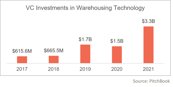 Venture investments have accelerated as investors respond to the intensified need for automation and digitalization to strengthen supply chains. Investors are targeting companies that offer solutions to managing warehouses, matching freight loads to transportation capacity, and mapping out cost-effective routes to move goods.2