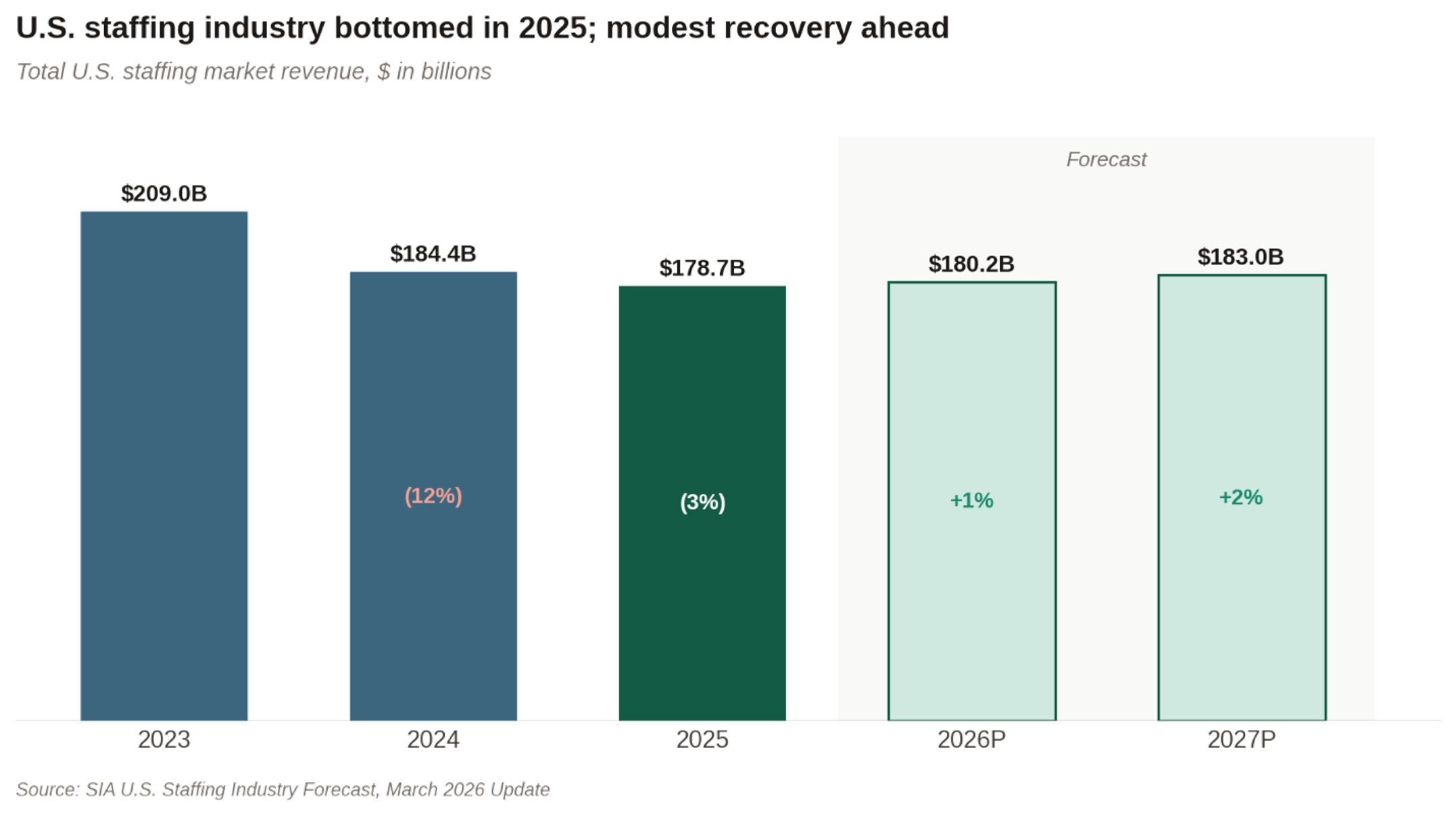 Staffing demand is not driven purely by job growth – it is also driven by labor churn. When hiring slows, churn declines, and so does demand for staffing services. As a result, even in a stable macro environment, the staffing industry has struggled to regain momentum, and the numbers reflect this dynamic. The U.S. staffing industry declined approximately 3% in 2025 to $178.7 billion. Growth is expected to return in 2026 and 2027, but only modestly, at around 1% to 2% annually. So, while the industry appears to have reached a bottom, a sharp rebound is unlikely while a static labor market persists. A meaningful recovery would likely require a resumption of labor market churn – where employees feel confident enough to change jobs and employers compete more actively for talent – alongside a steadying of client decision-making around AI's workforce impact.
