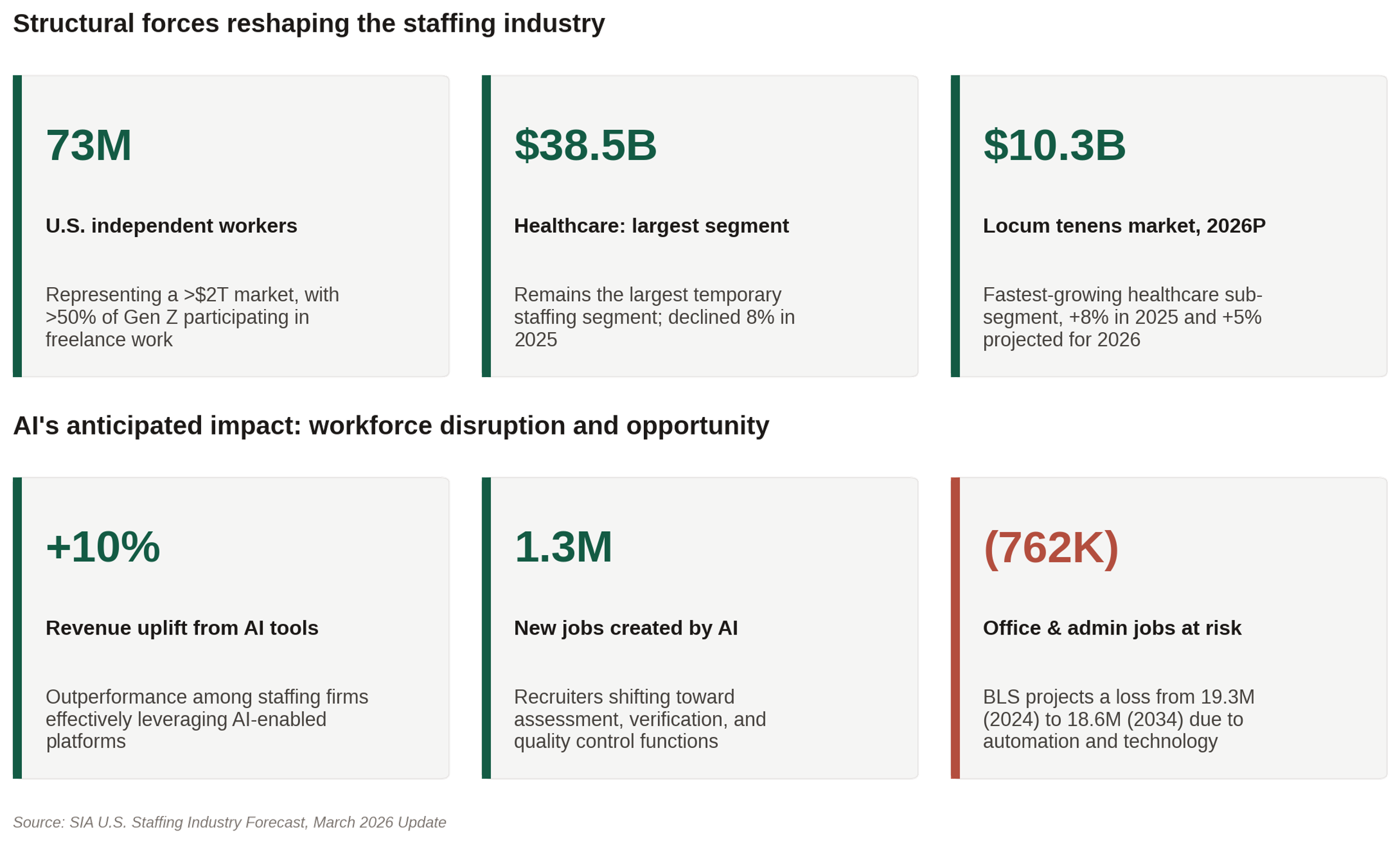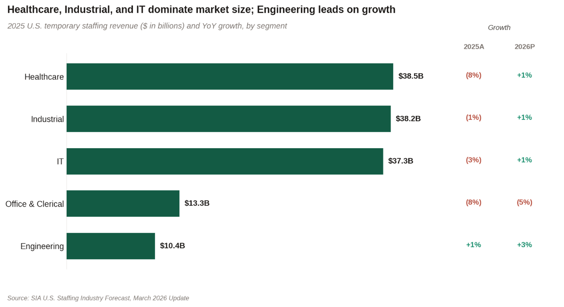 Healthcare remains the largest temporary staffing segment at $38.5 billion, though it declined 8% in 2025 as volumes continued normalizing from pandemic peaks. Within Healthcare, locum tenens stands out as the fastest-growing sub-segment, growing 8% in 2025 and projected to reach $10.3billion in 2026, driven by persistent physician shortages in key specialties.